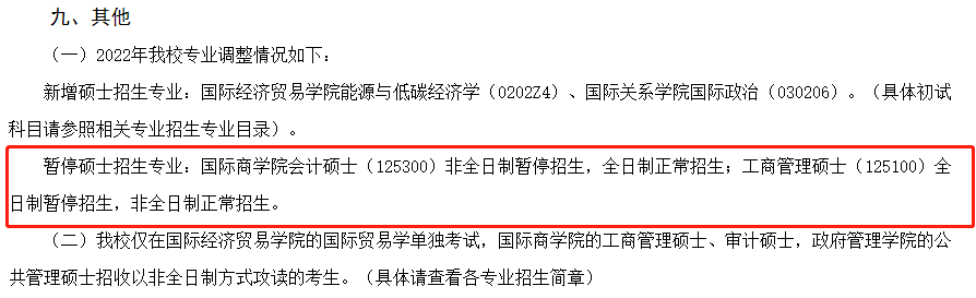 對外經濟貿易大學《2022年招收攻讀碩士學位研究生簡章》中公布,工商管理碩士(125100)全日制暫停招生,非全日制正常招生。