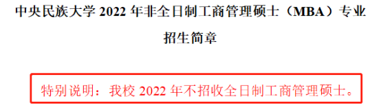 中央民族大學2022年招生簡章中特別說明:“我校2022年不招收全日制工商管理碩士”。