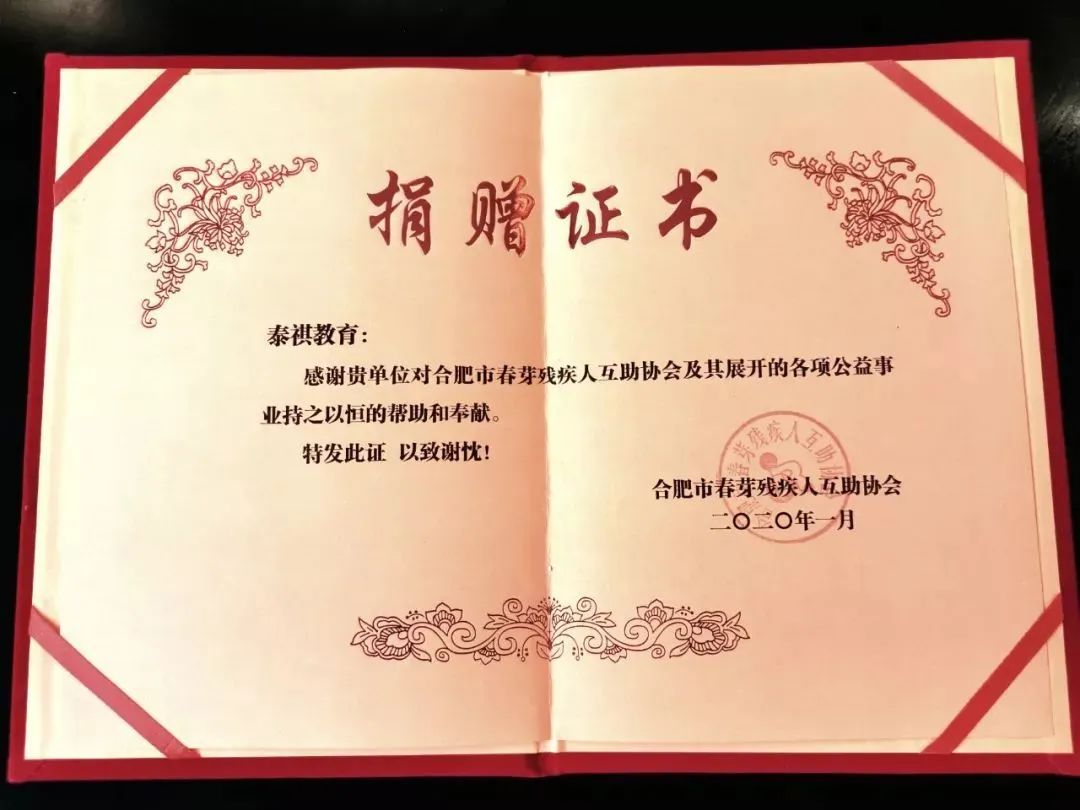 2024年1月12日,泰祺教育應邀參加“筑夢春芽 共享芬芳”春芽協會20周年感恩答謝會,協會為其頒布了“杰出愛心單位”獎,以感謝泰祺對合肥市春芽殘疾人互助協會自閉癥兒童康復做出的持之以恒的幫助和貢獻。泰祺教育區域校長孟新凱先生受邀出席答謝會并接受了頒獎。