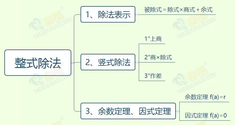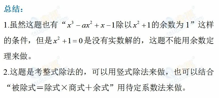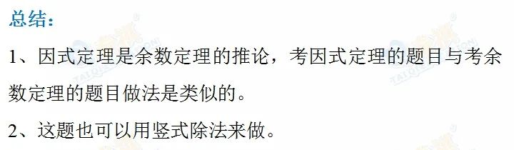 。有同學會說除數不能為零,為什么可以令除式為零呢?大家可以理解為:整式除法只是一個形式除法,列式子是乘法的形式,即“被除式=除式×商式+余式”;在乘法的形式下,可以令其中一個式子(原來的除式)為零。