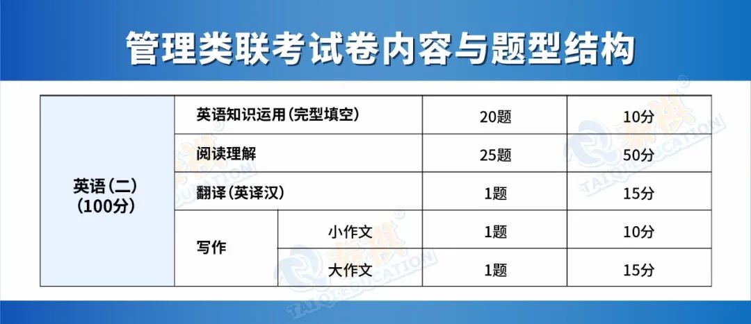 初試考試科目共2門:管理類綜合能力、英語(二),總分300分。