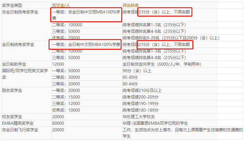 華東理工大學(xué)2023級(jí)獎(jiǎng)學(xué)金政策中明確表示,非全日制/全日制統(tǒng)考成績(jī)235分(含)以上,均可獲得中文班100%學(xué)費(fèi)的獎(jiǎng)學(xué)金。