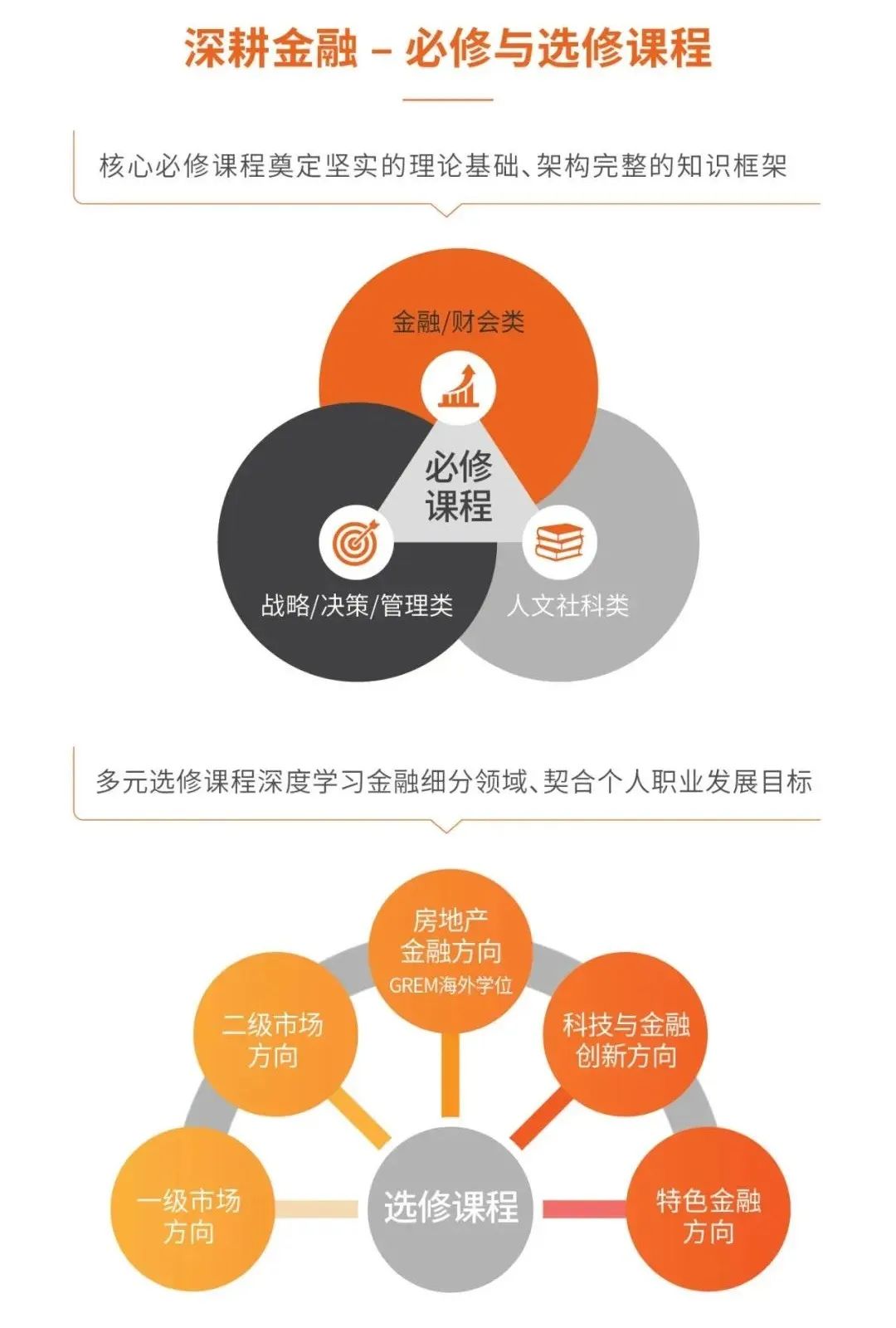 如圖為交大高金在職金融MBA的課程設置,分為“金融必修課”、“必修選修課”和“金融選修課”,其中50多門金融選修課程覆蓋金融各個領域的學習需求。包括一級市場的風險投資與私募基金,還有二級市場和交易工具等課程。