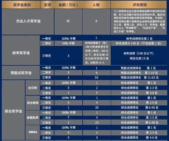 例如上海財經大學設置預面試獎學金,針對預面試成績排第1名的獎勵100%學費;第2-10名有5萬元的獎金;第11-65名有1萬元的獎金。