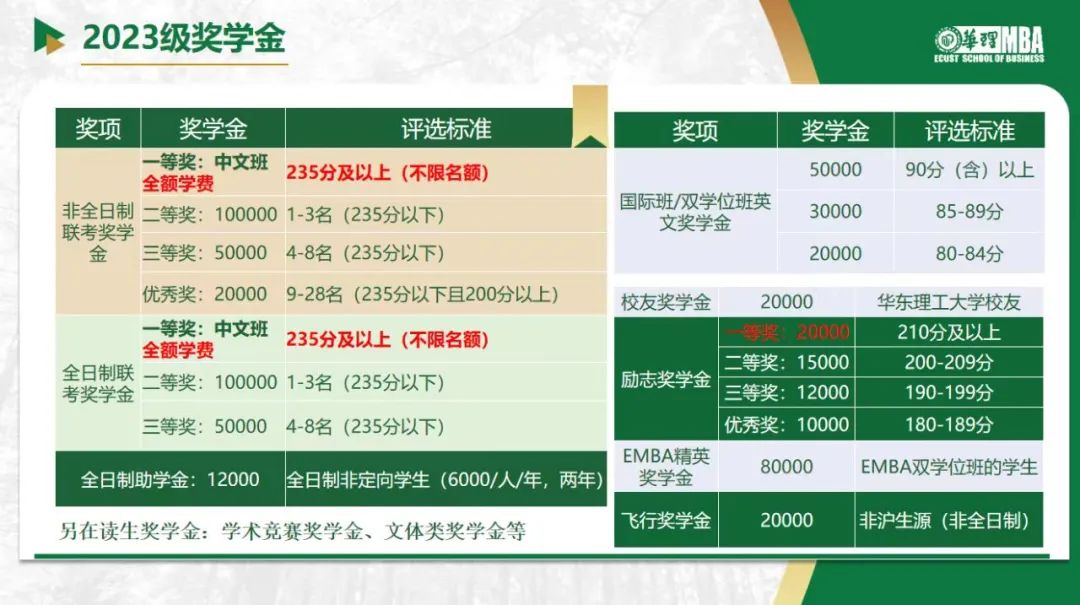 如華東理工大學2023級獎學金政策中明確表示,非全日制/全日制統考成績235分(含)以上,均可獲得中文班100%學費的獎學金。所以想報華理的同學,沖擊高分就是在賺錢啦!