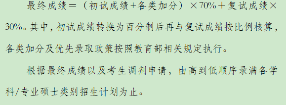 最終成績=(初試成績+各類加分)×70%+復試成績×30%。其中,初試成績轉換為百分制后再與復試成績按比例核算,各類加分及優先錄取政策按照教育部相關規定執行。