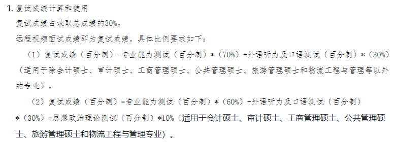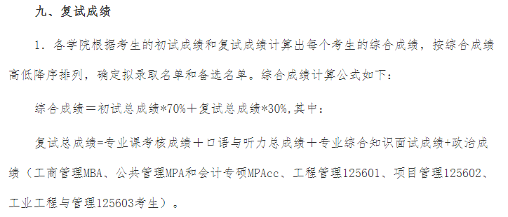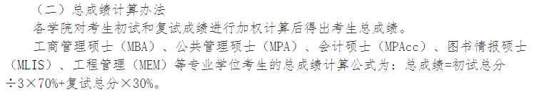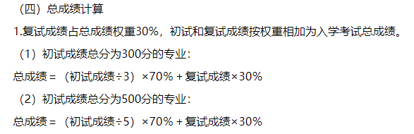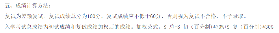入學考試總成績為初試成績和復試成績加權后的成績。加權公式:S總=S初(百分制)*70%+S復(百分制)*30%