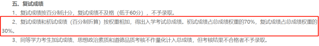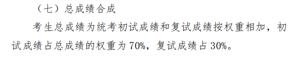 考生總成績為統考初試成績和復試成績按權重相加,初試成績占總成績的權重為70%,復試成績占30%。
