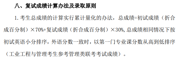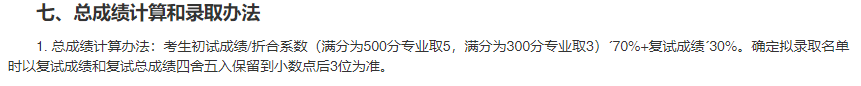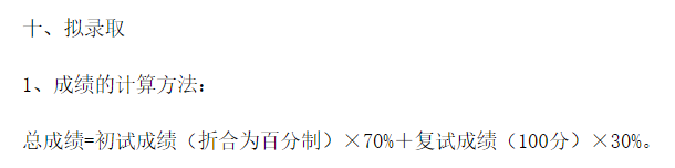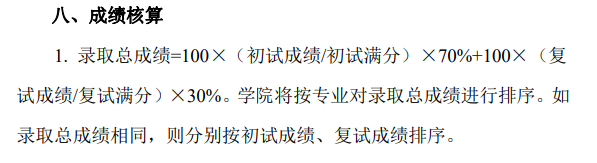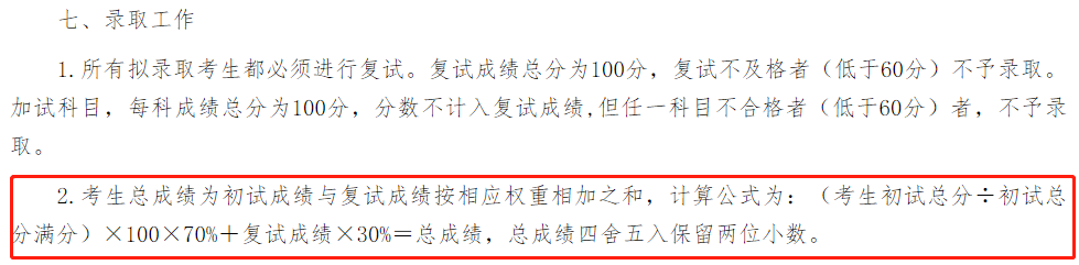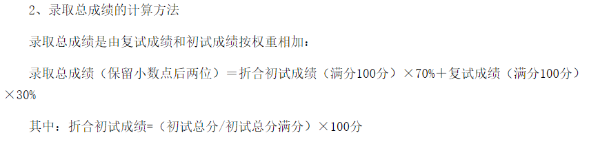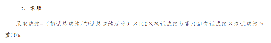 錄取總成績(保留小數點后兩位)=折合初試成績(滿分100分)×70%+復試成績(滿分100分)×30%