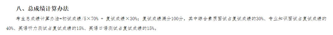 考生擬錄取總成績=(初試成績/3)×70%+(面試綜合能力成績×20%+面試專業知識成績×40%+面試外國語能力成績×20%+思想政治理論考試成績×20%)×30%。