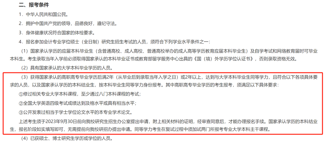 3. 獲得國(guó)家承認(rèn)的高職高專畢業(yè)學(xué)歷后滿2年(畢業(yè)后到錄取當(dāng)年入學(xué)前,下同)或2年以上的人員,以及國(guó)家承認(rèn)學(xué)歷的本科結(jié)業(yè)生,符合招生單位根據(jù)本單位的培養(yǎng)目標(biāo)對(duì)考生提出的具體學(xué)業(yè)要求的,按本科畢業(yè)同等學(xué)力身份報(bào)考;