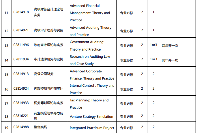 價(jià)值引領(lǐng)與職業(yè)規(guī)劃、高級(jí)微觀經(jīng)濟(jì)學(xué)、宏觀經(jīng)濟(jì)管理、金融計(jì)量經(jīng)濟(jì)學(xué)、投資學(xué)、商業(yè)倫理與職業(yè)道德、高級(jí)財(cái)務(wù)會(huì)計(jì)理論與實(shí)務(wù)、高級(jí)審計(jì)理論與實(shí)務(wù)、政府審計(jì)理論與實(shí)務(wù)、審計(jì)法律研究與案例、高級(jí)公司財(cái)務(wù)、內(nèi)部控制與內(nèi)部審計(jì)、稅務(wù)籌劃理論與實(shí)務(wù)、商業(yè)模擬與領(lǐng)導(dǎo)力、整合實(shí)踐等。