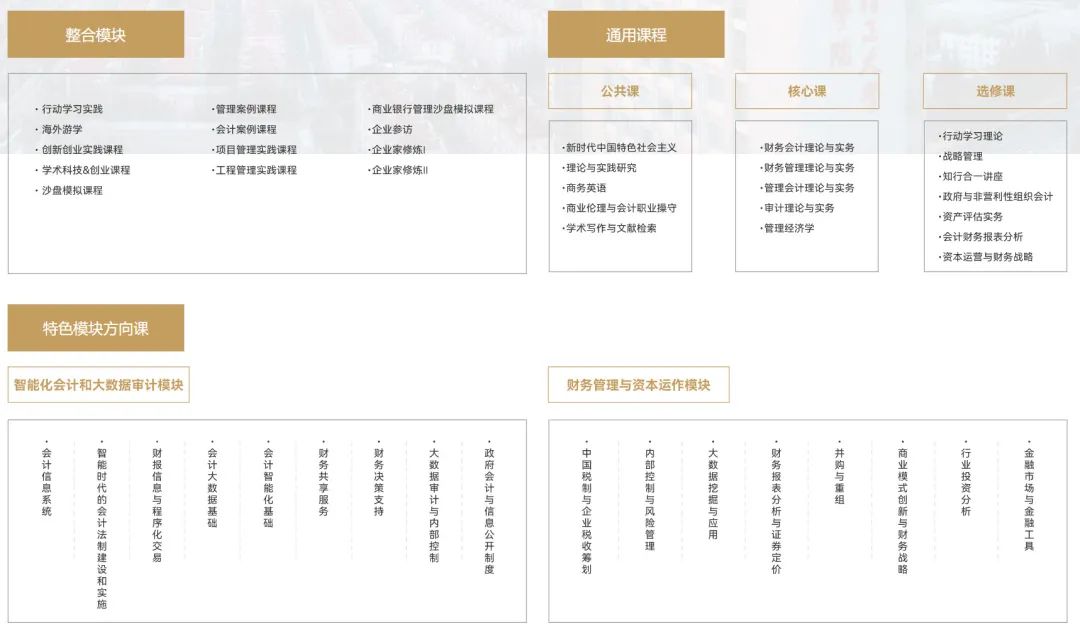 各高校MPAcc的課程設置并非完全統一,但基本都含公共課程、專業必修課程、專業選修課程三大課程板塊: