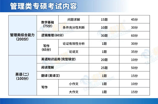 初試考199管理類綜合能力(簡稱管綜)和英語(二)兩科。具體題目類型及分值如下表: